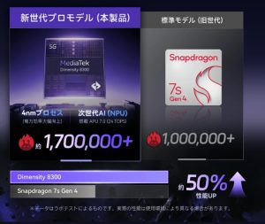 総合スコアなら本端末の性能が10万点ほど上。